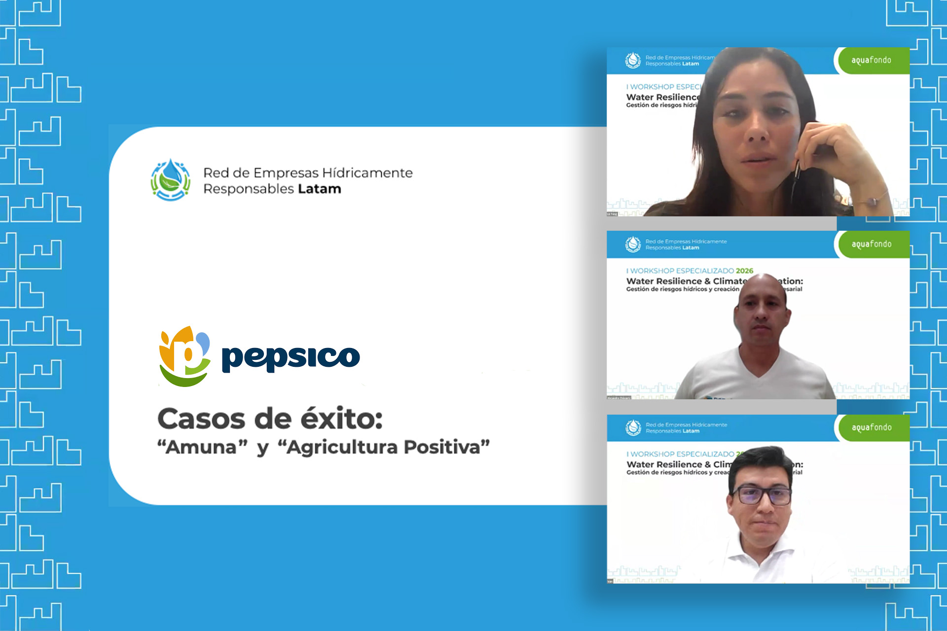 Desde Aquafondo, agradecemos la participación de todas las empresas miembro de la red: Backus, PepsiCo, Esmeralda Corp, Orygen, Nestlé, Netafim, Rotoplas, AJE, Tecnofil y GCM Perú. Así como los valiosos aportes de Marta Santafé Martínez y PepsiCo, que contribuyeron a enriquecer el diálogo y fortalecer este espacio de aprendizaje.