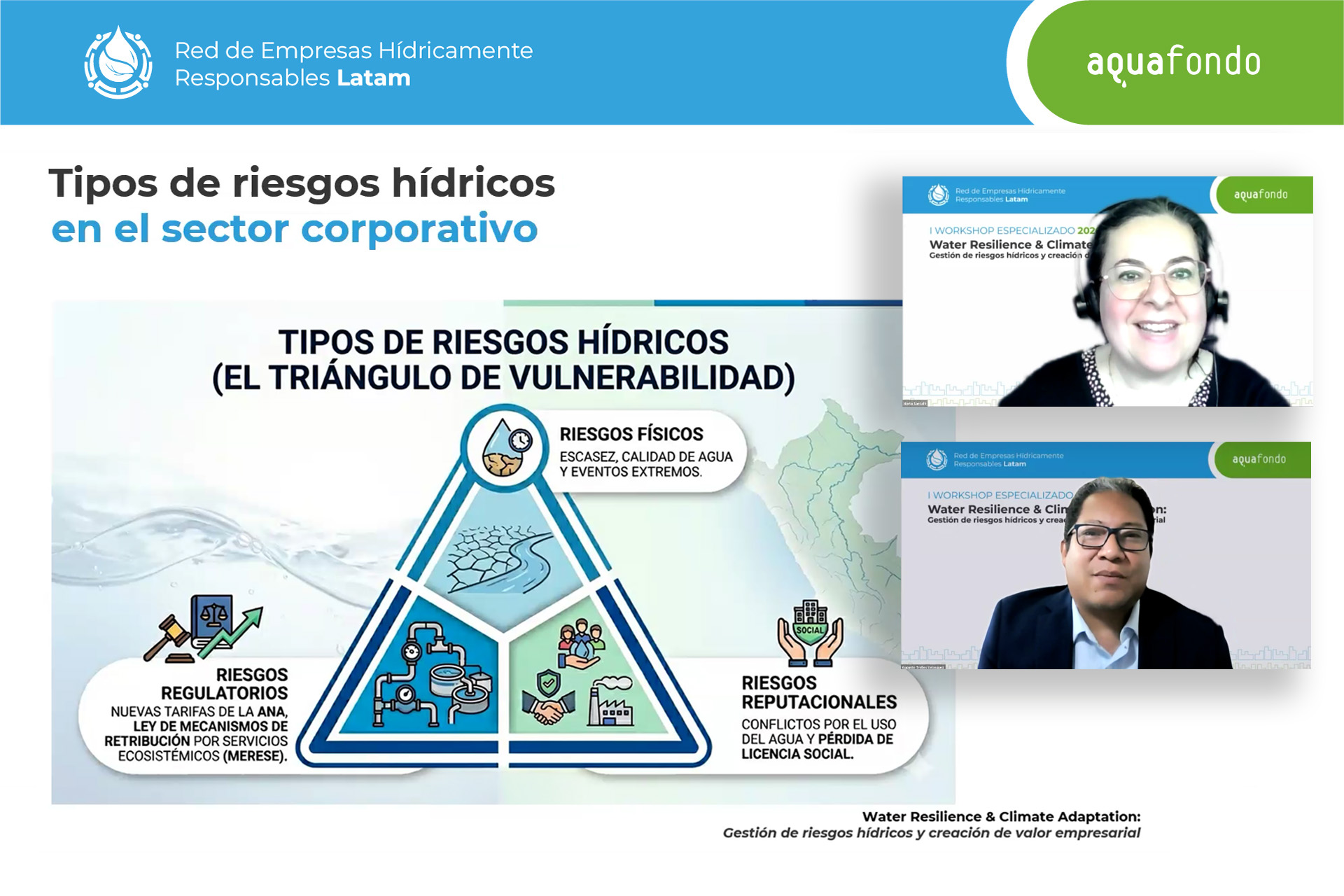 En un contexto de creciente presión sobre los recursos hídricos, Aquafondo realizó el I Workshop Especializado 2026: Water Resilience & Climate Adaptation – Gestión de riesgos hídricos y creación de valor empresarial, dirigido a las empresas miembro de la Red de Empresas Hídricamente Responsables (EHR).